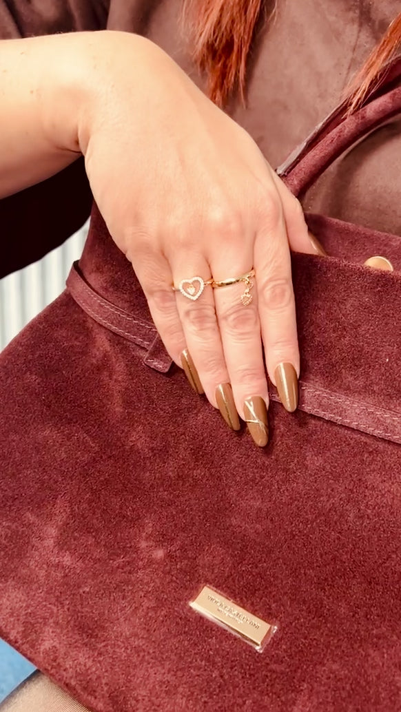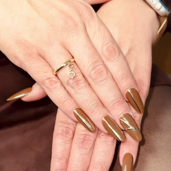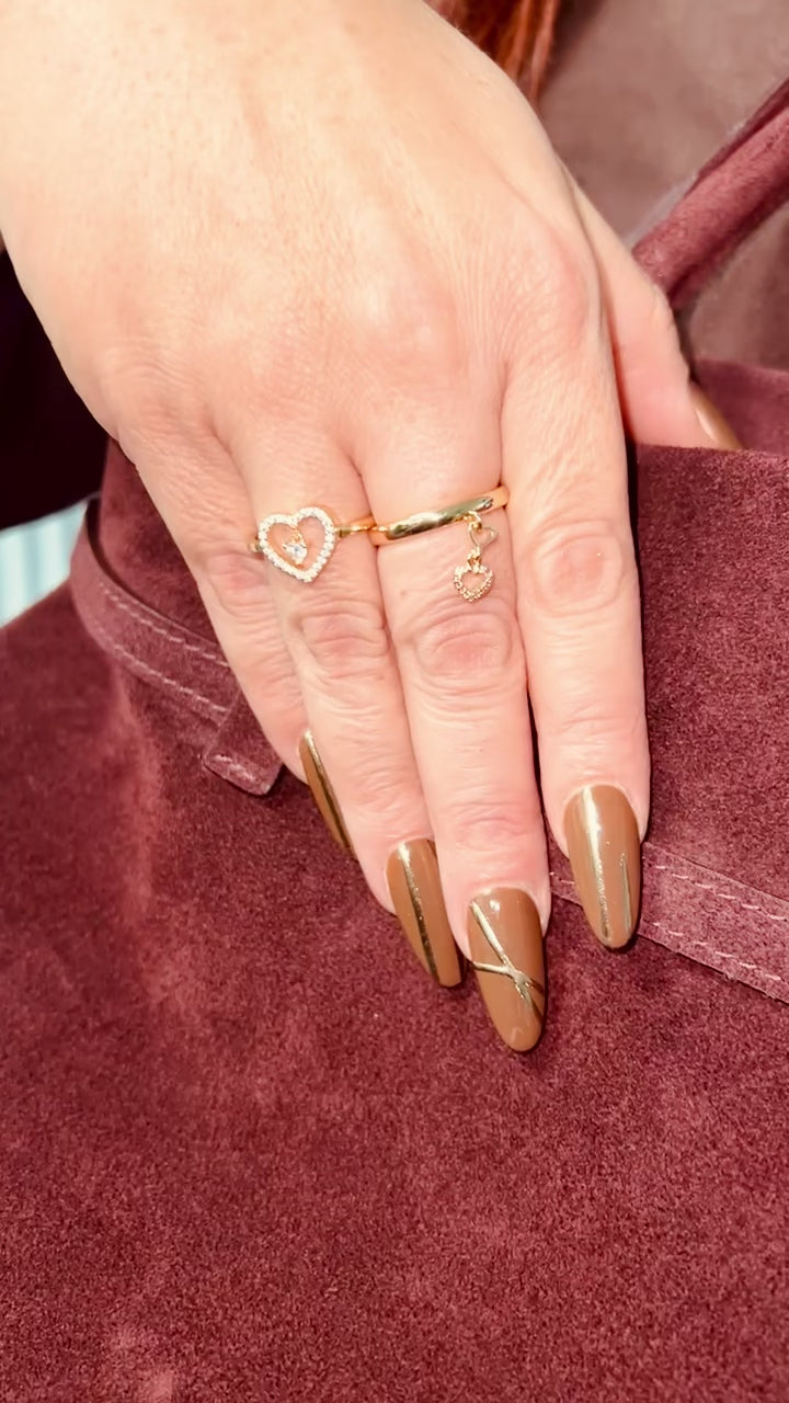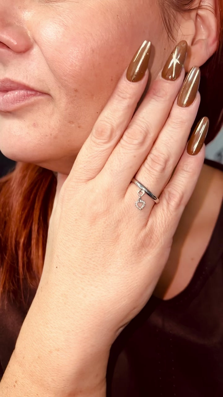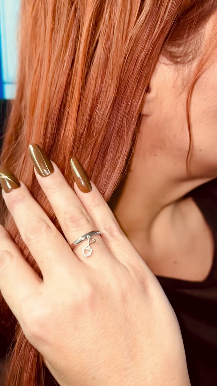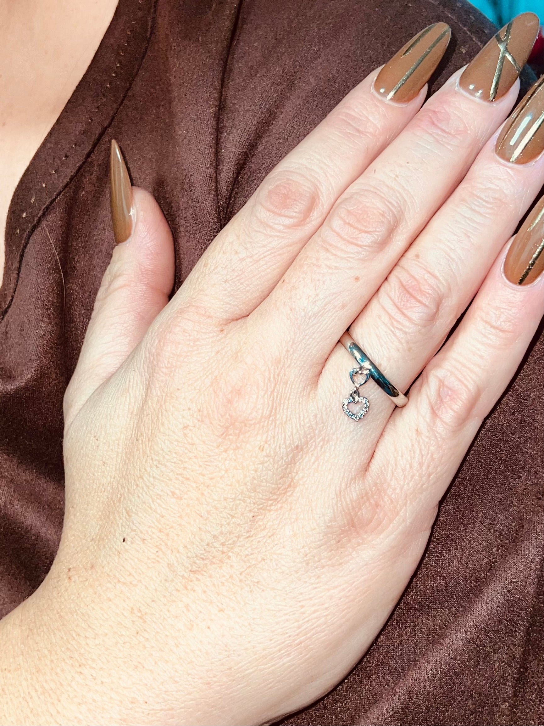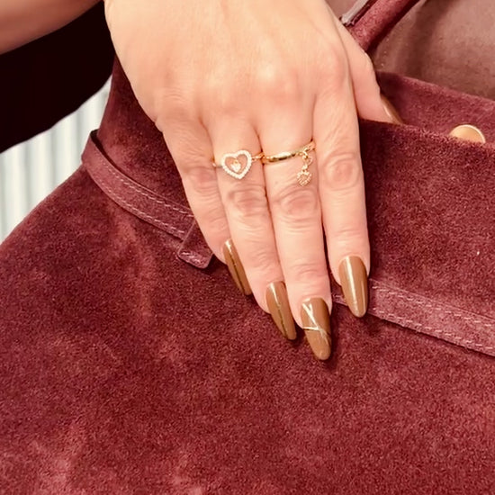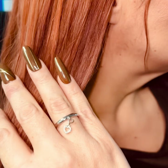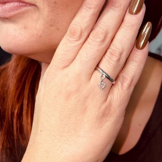 Radiating elegance and charm, this ring features a sleek, polished band paired with a delicate dangling heart charm encrusted with shimmering gemstones. The minimalist design is elevated by the playful movement of the charm, making it a timeless piece that exudes both sophistication and personality. Not sure about your ring size? Check our size guide before ordering.